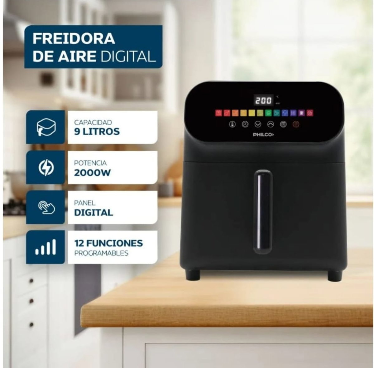 La freidora de aire Philco combina potencia y eficiencia en un diseño elegante y moderno. Con una capacidad de 9 litros y una potencia de 2000W, esta freidora permite preparar una gran variedad de platillos de manera rápida y saludable. Su control digital y pantalla táctil facilitan la selección de la temperatura adecuada, asegurando resultados perfectos en cada uso.